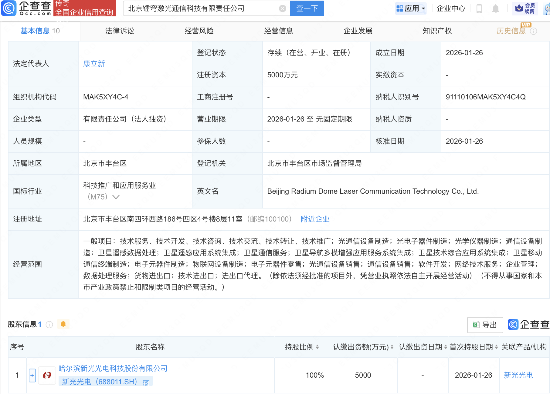 近日,北京镭穹激光通信科技有限责任公司成立,注册资本5000万元,经营范围包含:卫星遥感应用系统集成;卫星通信服务;卫星导航多模增强应用服务系统集成;卫星技术综合应用系统集成;卫星移动通信终端制造等。企查查股权穿透显示,该公司由新光光电(688011)全资持股。