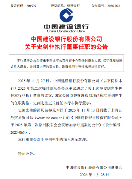 1月28日,中国建设银行股份有限公司发布关于史剑非执行董事任职的公告,国家金融监督管理总局现已核准史剑先生的任职资格。
