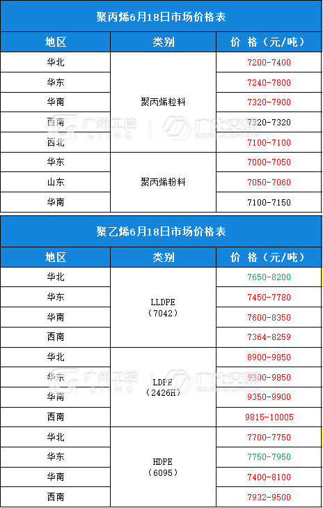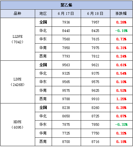 今日,聚乙烯市场延续上涨态势,价格以涨为主。LLDPE(7042)市场价格为7957元/吨,较上一工作日上涨21元/吨,涨幅为0.26%;LDPE(2426H)市场价格为9621元/吨,较上一工作日上涨58元/吨,涨幅为0.61%;HDPE(6095)市场价格为8260元/吨,较上一工作日上涨23元/吨,涨幅为0.28%。伊朗与以色列局势暂无缓和迹象,国际原油价格上涨,成本支撑凸显,聚乙烯市场重心继续上移。但受制于下游消费淡季,聚乙烯市场供需格局暂无实质性好转,因此导致现货市场价格跟涨幅度相对较小。