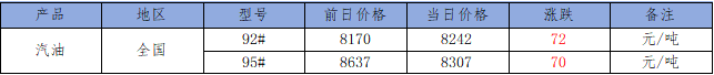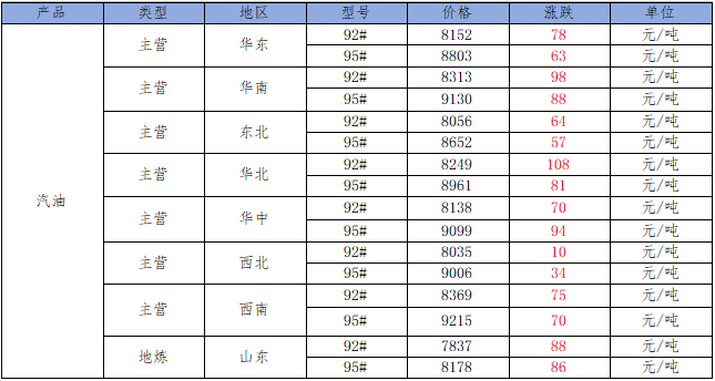 预计下个工作日主营汽油价格稳中小涨。地炼汽油价格小幅上涨。