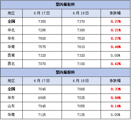 今日,聚丙烯市场偏强震荡,价格小幅上涨。PP粒料均价为7370元/吨,较上一工作日上涨20元/吨,涨幅为0.27%;PP粉料均价为7038元/吨,较上一工作日上涨23元/吨,涨幅为0.33%。伊以局势仍存加剧迹象,国际原油价格上涨,成本端支撑维持强势,带动聚丙烯市场情绪升温。然下游需求持续疲软,市场实际成交依然有限,并且随着前期停车装置陆续恢复,供应压力较大,供需格局对市场压制明显,价格涨幅相对有限。